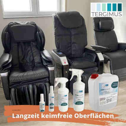 "Sappiamo dai nostri clienti commerciali che la disinfezione delle superfici in spazi pubblici come ospedali e istituzioni sociali richiede tempo e denaro. Questo è un problema anche negli studi di fitness, nelle aree di ricevimento o nelle isole relax delle aziende", spiega Roedeske. "La disinfezione dopo ogni utilizzo richiede molto tempo e non è adatta all'uso quotidiano. Questo mercato sarebbe completamente crollato per noi senza prodotti igienici adeguati", è sicuro. Nella sua ricerca di un prodotto adatto alle superfici delle poltrone da massaggio, si è imbattuto nell'azienda TERGIMI dal termine latino tergere = pulire. Entrambe le aziende sono attente alla salute e alla sostenibilità, quindi la collaborazione era ovvia. Il detergente medico PUREMANENT è a base d'acqua e si prevede anche di riempirlo in bottiglie di plastica marina.