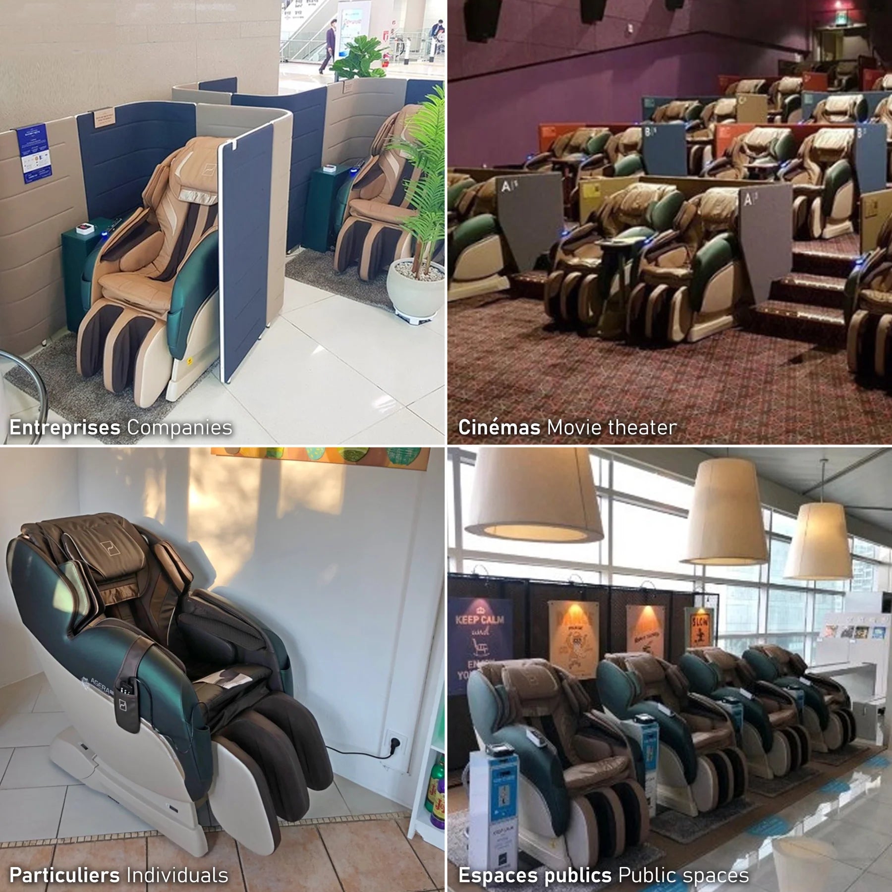 - Massaggio a cuscino d'aria: le nostre poltrone sono intelligentemente dotate di diversi cuscini d'aria per massaggiare le parti del corpo in modo più preciso.