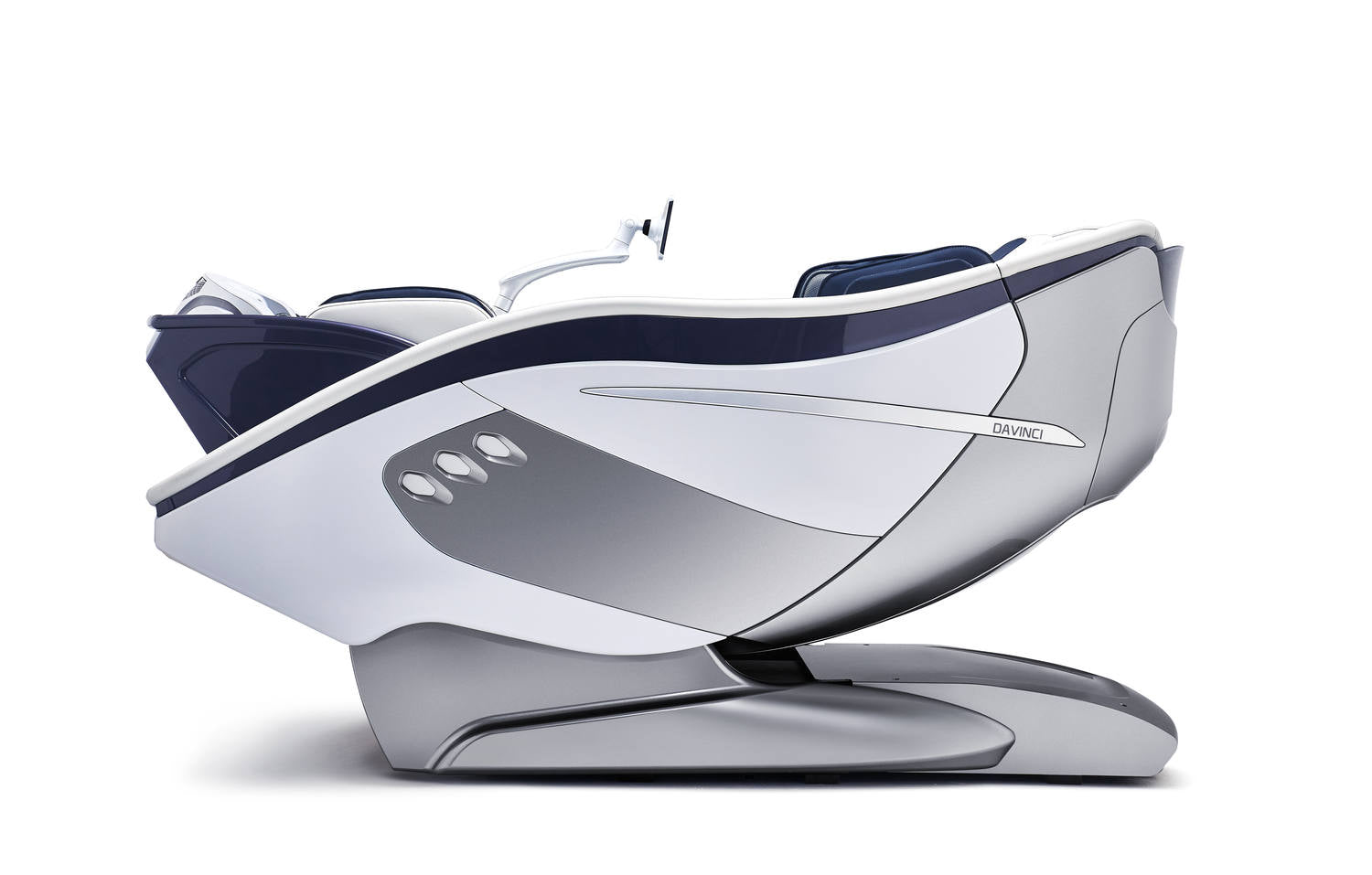 "DaVinci è stato un progetto impegnativo. Ci ha portato a esprimere appieno la nostra esperienza nel progettare tecnologie con coerenza ed equilibrio. Compatto, iconico, razionale e distintivo, DaVinci ha un chiaro effetto "cocooning", un guscio avvolgente e protettivo dall'ergonomia elegante, per rilassarsi e, soprattutto, per beneficiare delle molteplici funzioni di cui DaVinci è dotato. La palette di colori utilizzata per DaVinci fa riferimento al mondo medicale, con il blu, colore dei sanitari e del benessere, e il bianco, colore ideale per il settore medico e tecnico. I componenti in grigio metallizzato si riferiscono ai nostri numerosi prototipi di ricerca automobilistica. In generale, c'è un esplicito riferimento al mondo automobilistico, riconoscibile da caratteristiche come gli elementi luminosi laterali che indicano quale tipo di massaggio è attualmente attivato, o la trottola direttamente sotto il poggiapiedi."
