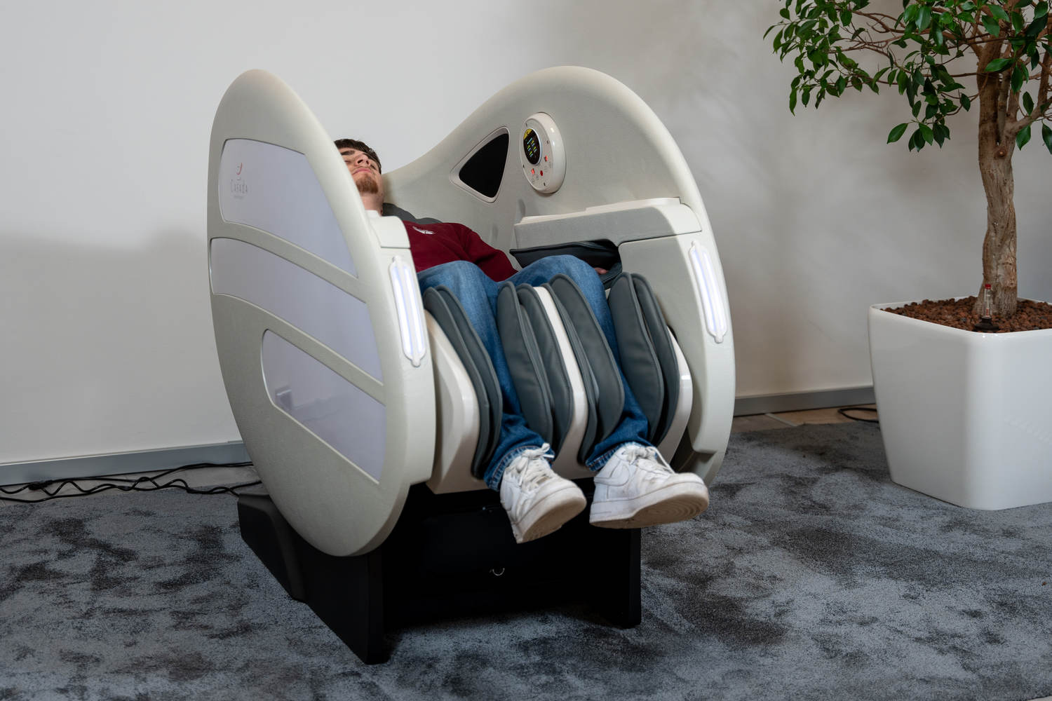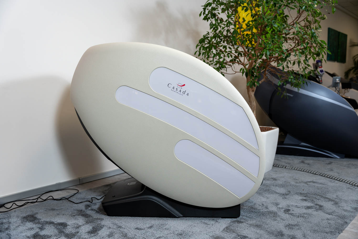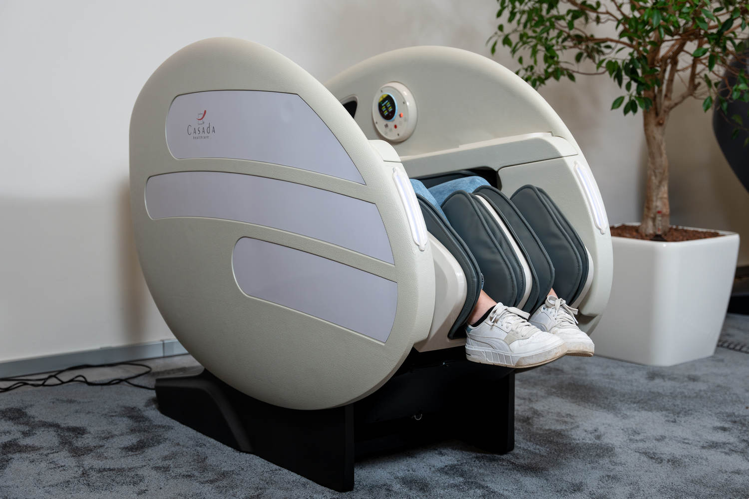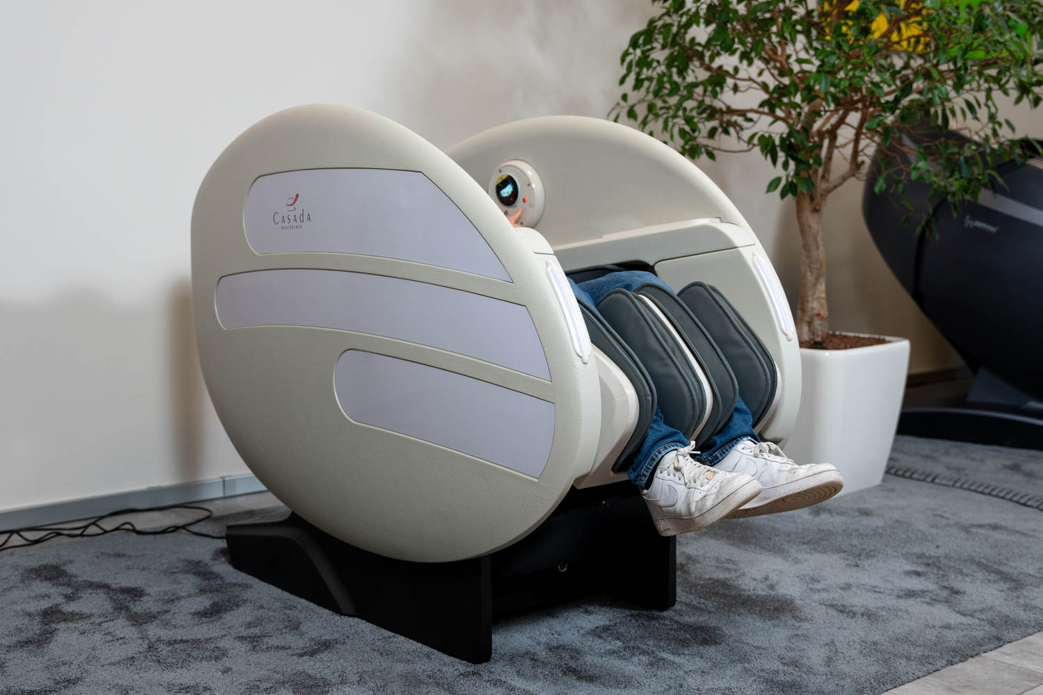 Casada Atlas è una poltrona massaggiante unica nel suo genere che può essere utilizzata per creare zone di relax in aree pubbliche. aree pubbliche. La sua particolarità è il design futuristico a capsula, che nasconde tecnologie di massaggio avanzate. Inoltre, la posizione reclinabile e i lati incassati della poltrona offrono all'utente un relax spensierato con una sensazione di sicurezza. sensazione di sicurezza e privacy anche in ambienti molto affollati.