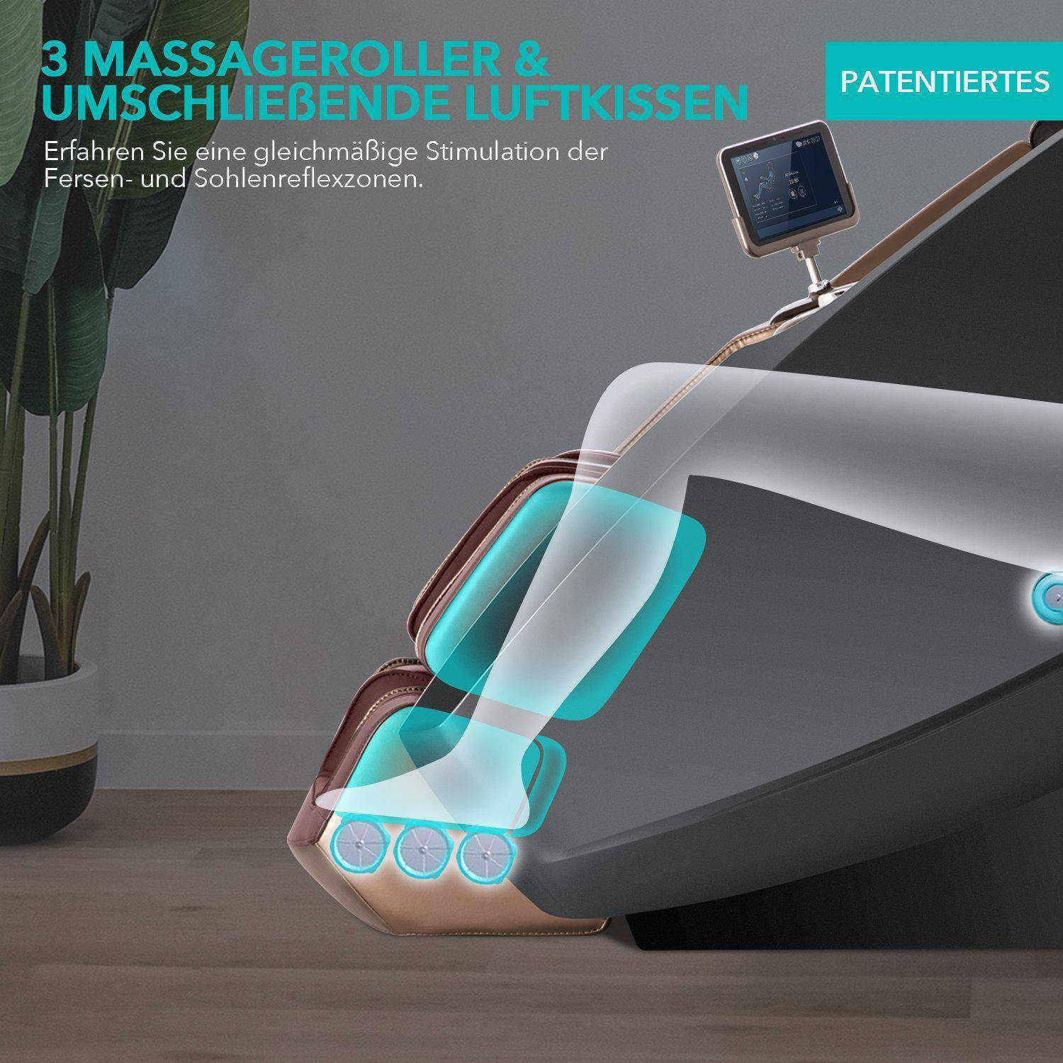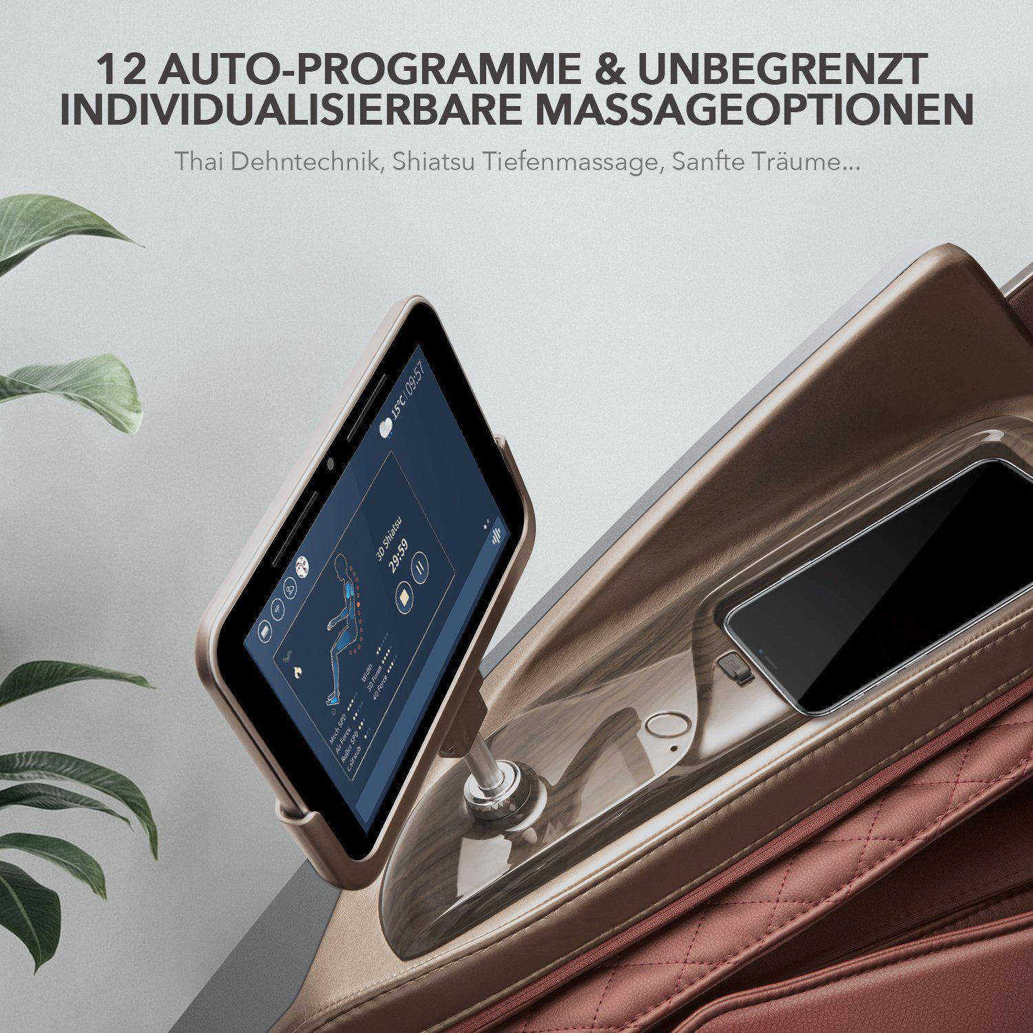 Il suo funzionamento rapido e facile da usare, con i pulsanti sul bracciolo e sul touch pad senza fili, offre la possibilità di regolare in modo completamente automatico la posizione di seduta e l'angolo di inclinazione. Con il suo esclusivo meccanismo a doppio massaggio, la "capsula spaziale" con un totale di 6 rulli offre un programma di coccole che fa impallidire molti prodotti della concorrenza - su richiesta è possibile impostare un'intensità di massaggio molto potente. Grazie all'ingegnosa tecnologia dei sistemi di binari a S e a L, abbinati a un meccanismo a rulli con una portata di 63 cm, potrete godere di un massaggio preciso per collo, spalle, schiena e colonna vertebrale.