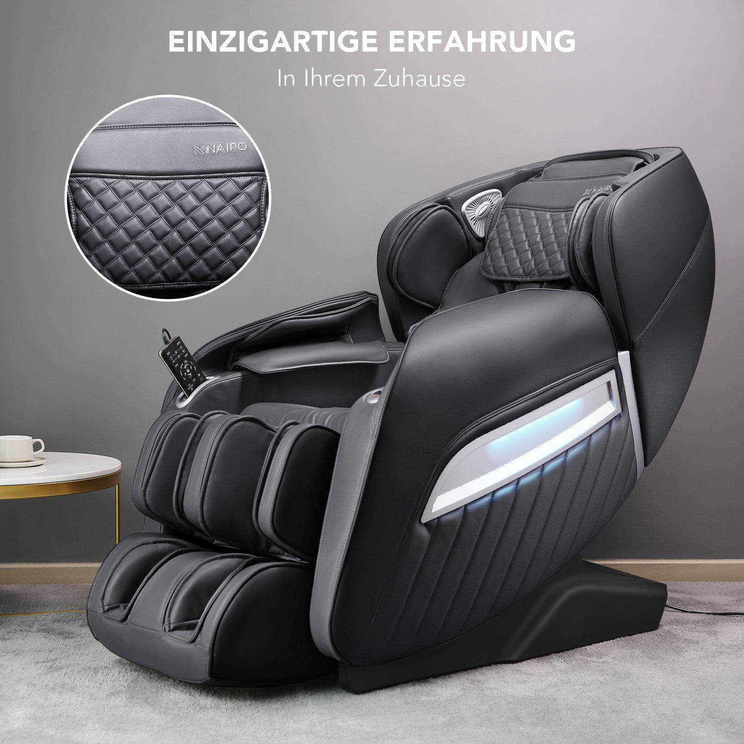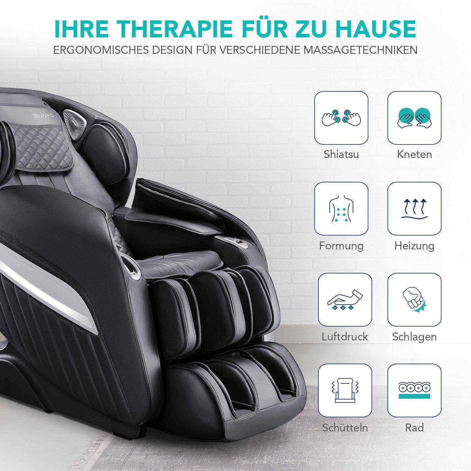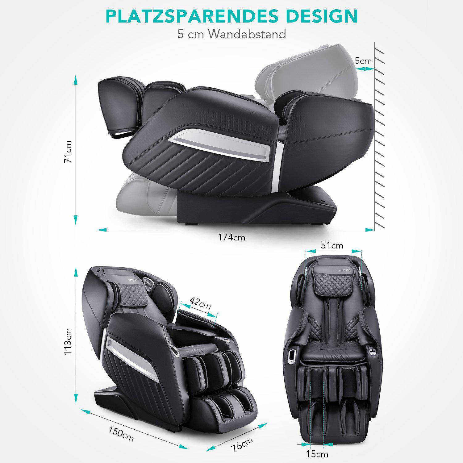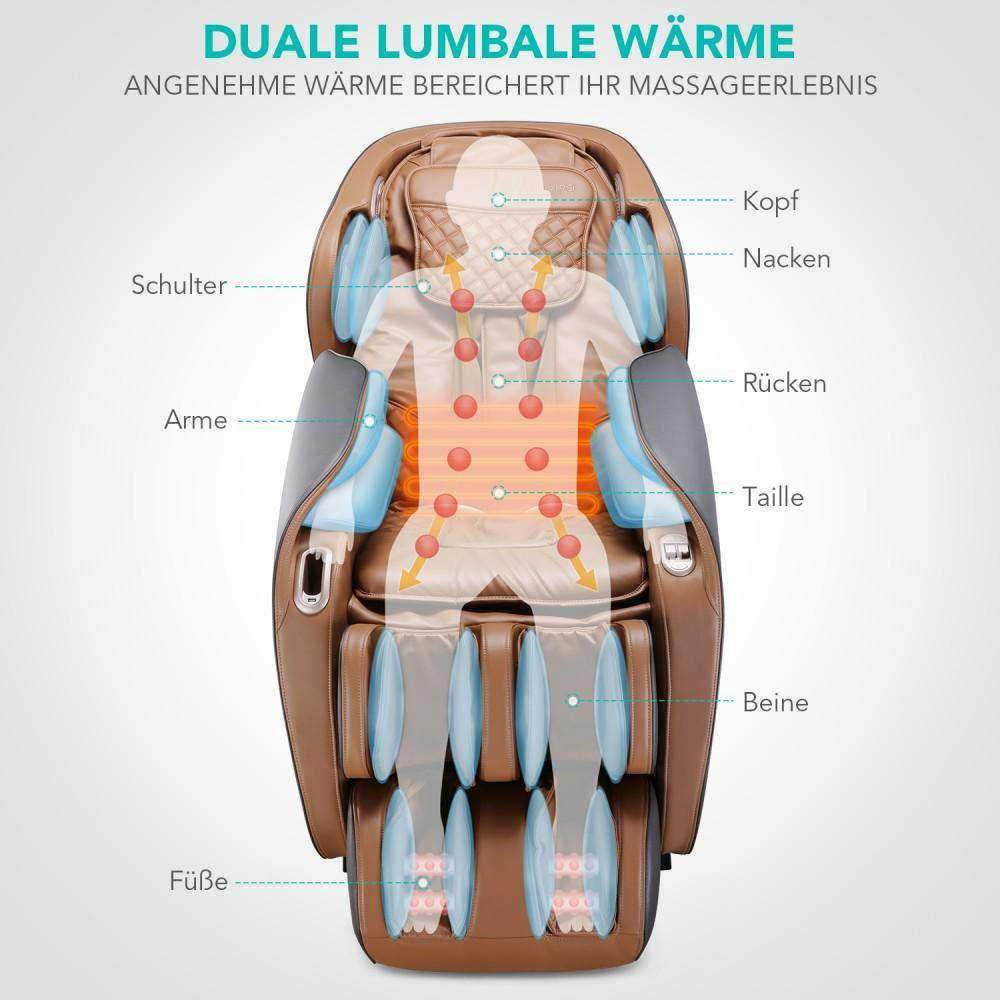 Nonostante l'aspetto attraente, c'è una buona ragione per cui non dovreste ridurre il vostro nuovo miracolo del massaggio solo al suo aspetto: Tramite un telecomando intuitivo, è possibile godere di una terapia di rilassamento salutare dalla testa ai piedi con la semplice pressione di un pulsante. Un'ampia varietà di posizioni per le spalle, livelli di velocità, movimenti del rullo e intensità della pressione dell'aria garantiscono un'esperienza di massaggio completamente in linea con le vostre preferenze. Un punto di forza appositamente creato sono le due posizioni "Zero Gravity" regolabili individualmente: Con un sollievo ottimale per la colonna vertebrale, potrete assaporare una sensazione unica di assenza di peso mentre vi godete la comoda seduta del "principiante". Da lodare anche gli airbag di alta qualità e i rulli massaggianti nella zona della pianta del piede, che sciolgono i muscoli e contribuiscono a una sana mobilità. Nel frattempo, una potente funzione di riscaldamento avvolge la zona lombare in un accogliente calore e rende l'"Einsteiger" il vostro nuovo luogo di benessere.