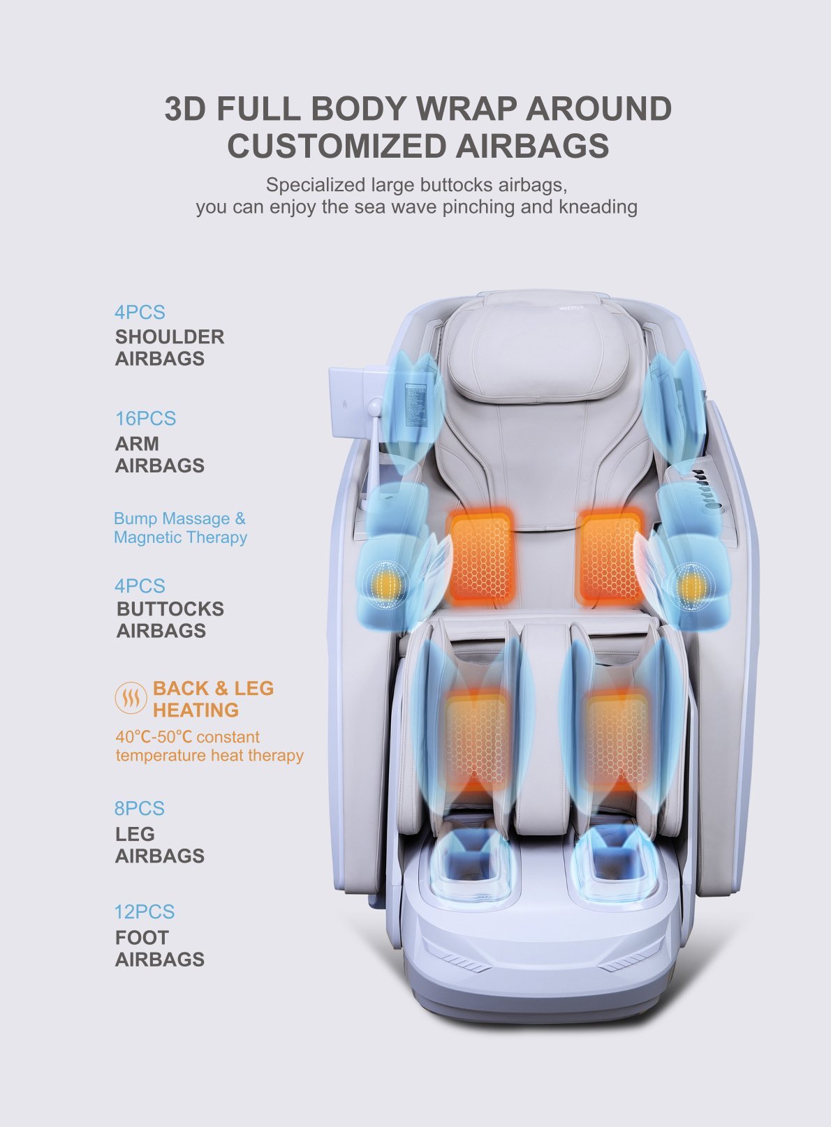 Airbag - piedi Airbag - livello di intensità regolabile Airbag - cosce Airbag - spalle Airbag - avambraccio Airbag - polpacci Illuminazione ambientale Audio - Bluetooth Audio - altoparlanti integrati Comandi - integrati Comandi - tablet Sensore del livello di ossigeno nel sangue Poggiapiedi regolabile in continuo Poggiapiedi - regolabile elettricamente Riscaldamento - torace/addome Riscaldamento - petto riscaldamento - cintura riscaldamento Riscaldamento - lombare Riscaldamento - polpacci Sensore della frequenza cardiaca Body scan - aut.