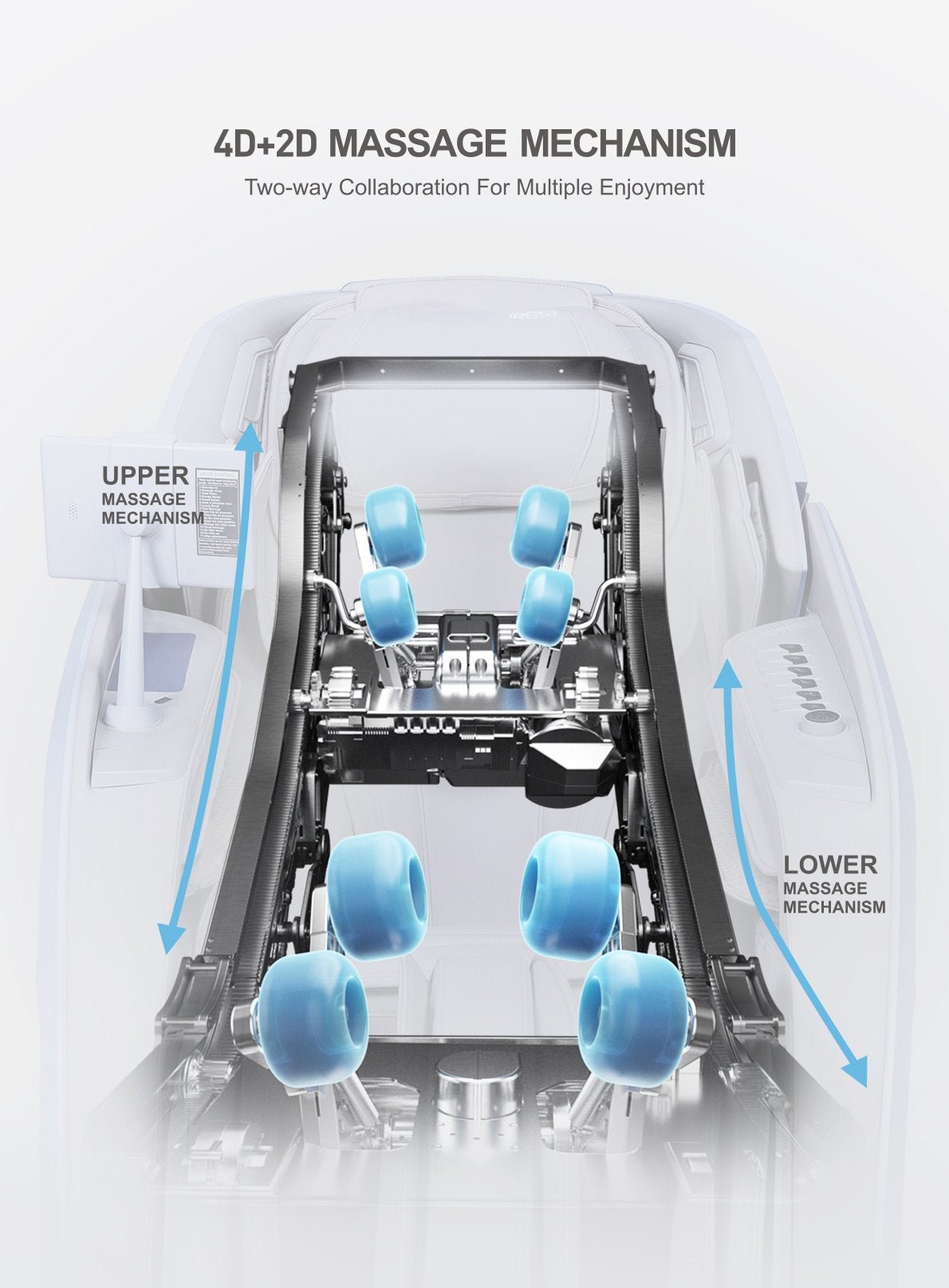 4D+2D Schienale regolabile in continuo Imbottitura dello schienale rimovibile Uscita vocale Controllo vocale Funzione timer con spegnimento automatico Ruote di trasporto Presa di ricarica USB Timer regolabile Posizione a gravità zero (senza peso) Design a parete zero