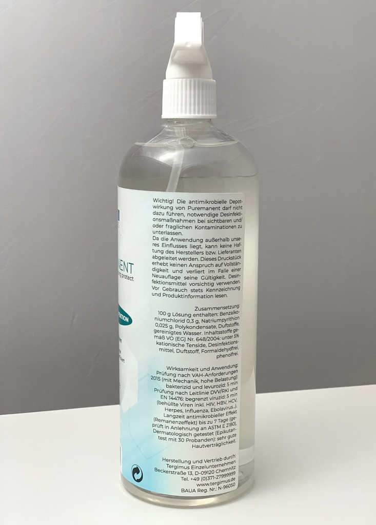 PUREMANENT contiene inizialmente lo 0,0% di alcol, che evapora rapidamente. I principi attivi che attivano i germi sono moderni composti di ammonio quaternario che agiscono in breve tempo e aderiscono bene alle superfici. Ma la particolarità del nostro disinfettante è un additivo che solo PUREMANENT possiede. Agisce come un conservante facendo aderire molto bene i principi attivi germicidi alle superfici. L'aspetto piacevole è che l'effetto non si vede né si sente (non è appiccicoso). Al contrario: l'additivo crea un effetto più facile da pulire sulle superfici (effetto easy-to-clean), che in misura limitata è anche repellente allo sporco. Anche dopo migliaia di tocchi, la protezione rimane attiva. Anche la successiva pulizia con acqua e detergenti neutri non può distruggere il deposito attivo. Guardate il nostro video su YouTube che ne spiega la piena efficacia.